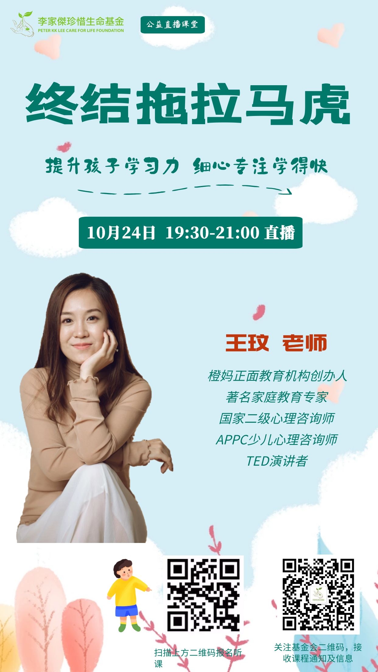 10月24日晚,继续邀请 王玟老师专题为家长们分享,如何构建和培养孩子的细致力,让孩子的思维方式和行为习惯实现双重提升,可以一次将事情做对,在学习和生活表现上建立自己的优势。